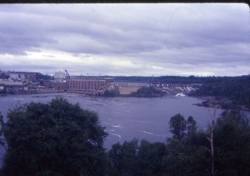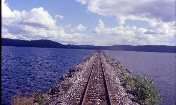 We climbed high on the valley's south slope and at Milepost 95, crossed over the Rivière du Milleu viaduct, the highest bridge in eastern Quebec at 196.1 feet above the river, which reminded me of the Clio Viaduct in the Feather River Canyon in California. At Milepost 117, the Abitibi went through a seven hundred foot tunnel and a few minutes later, we arrived at La Tuque where we picked up more passengers, their backpacks and a canoe. It was here where our route turned to the west. As we departed, we passed Lac Tuque then climbed a line relocation and through another 769 foot tunnel before passing a large hydroelectric plant seen through the trees. We followed its lake for many miles with it again reminding me of the former Western Pacific route through the Feather River, then crossed the lake on a truss bridge and a few miles later, crossed the river again on a high bridge where we stopped to let some backpackers off at a very good fishing hole, so I was told. We passed several more lakes and stopped at McTavish to drop off and pick up a few more passengers.