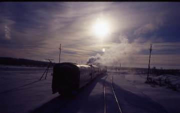 VIA 693 The Hudson Bay 12/14/1999This train, formerly known as Northern Spirits, is a twice weekly passenger train operated by VIA Rail and is the only dry-land connection between Churchill and the rest of Canada. The service, which runs through Manitoba and Saskatchewan, travels on the Canadian National Railway line north to The Pas, where it transfers to the Hudson Bay Railway, passing through Wabowden, Manitoba, with a spur from Sipiwesk to Thompson, and Gillam on its way to the Port of Churchill on Hudson Bay.