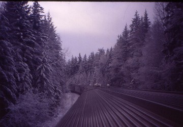 I put my jacket sleeves over my hands and climbed down to take the picture then climbed back up with my hands in the sleeves and opened the cab door the same way. Just as I walked in, the engineer was holding my gloves saying "Miss these, did you!" I said "Yes, I surely did". He said "Do not feel bad. The first three times I climbed off the engine here in weather like this, I did the same thing." We both laughed hard at that one. We proceeded south towards the afternoon sun, which was at thirty degrees in the sky and the tracks twisted and turned their way across the hilly landscape. We were travelling through the Tiaga, whose trees are so thin that they are not good for much, except with billions of these trees, they must produce a large amount of oxygen for our planet.