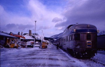 12/11/1999 I awoke the next morning north of the Cantara Loops with low clouds hiding the views of Mount Shasta. The Parlour Car's nice comfortable chairs were the spot to watch the Northern California and Southern Oregon scenery pass then I detrained at Klamath Falls on a very cold morning to two passengers smoking marijuana right on the platform. One word: "Stupid!" Departing an hour-and-a-half late, I returned to my room to listen to some music all the way to Chemult, where I went to the Parlour Car for a better view of our crossing of Cascade Summit. The landscape was very dramatic and a forebearer of what was to come in Canada. I went downstairs and watched "Bowfinger" again before detraining for fresh air at Eugene then observed Larry lead the wine tasting in the Parlour Car and at Portland, Santa Claus was in the station. We departed there a mere thirty minutes late and crossed the Columbia River into Washington. Last night's dinner was so good, I repeated it and have never had a bad meal on this train. That evening, I watched the end of "Bowfinger" yet again before returning to my room for some music then at Tacoma, I thanked Larry for his service to me on this trip and when we arrived in Seattle on time, we had to pull past the station due to all the construction for the Sounder commuter trains.