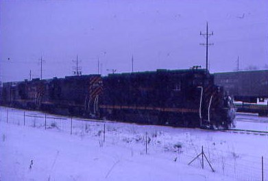 Denver and Rio Grande Western 3174 with it lead unit still in Conrail Blue as the Grande bought the unit second hand at Palmer Lake, Colorado on 12/20/1983.