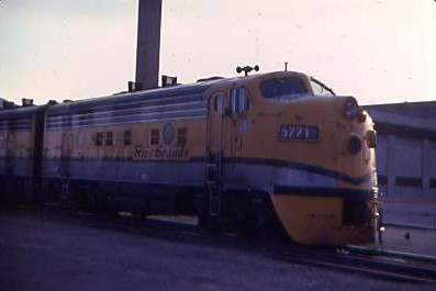 6/21/1982 -- Denver and Rio Grande Western F7A 5771, built by Electro-Motive Division in 1955 and retired in 1996. It was removed from regular Rio Grande Zephyr passenger service on 23 April 1983 and stored serviceable on 30 September 1984 after being used regularly on ballast unit trains. It is preserved at the Colorado Railroad Museum in Golden.