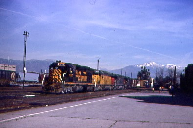April 1979 -- Denver and Rio Grande Western SD45 5337, built by Electro-Motive Division in 1968 and retired in December 1993. It was was sold to Morrison Knudsen in Boise, Idaho in February 1994 and rebuilt to SD40M-2 by MK Rail, becoming Southern Pacific 8682 then was assigned Union Pacific 4708. This led a Union Pacific and two Southern Pacific locomotives through San Bernardino, California.