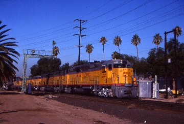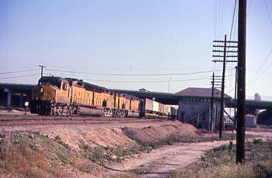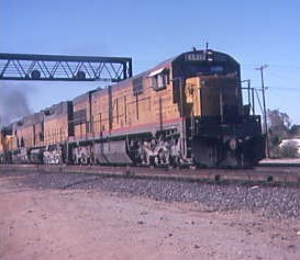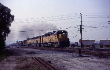 1977 -- Union Pacific DDA35 83, built by Electro-Motive Division in 1965, retired in 1979 and scrapped in 1980, led the livestock express through Walnut, in the eastern part of Los Angeles County, as seen on a bicycle ride from Santa Ana.