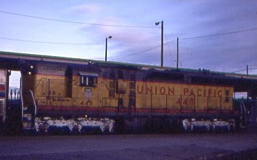 April 1980 -- Union Pacific SD24 448, nee EMD demonstrator 5579, built by Electro-Motive Division in 1958, switches the through cars off the Desert Wind at Ogden Union Station. It was rebuilt by EMD to an SD24 and sold to Union Pacific in August 1961. For warranty purposes, Union Pacific's records show the unit as being built in August 1960, the same time that EMD rebuilt the locomotive. The builder's plate showed the build date as July 1958.