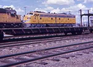 August 1974 -- Union Pacific E9A 954, built by Electro-Motive Division in 1955, retired in 1980 and subsequently scrapped the same year, sat in Spokane, Washington.