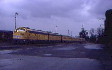 1977 -- Leading a special train at San Bernardino on a rainy morning was Union Pacific E9A 960, built by Electro-Motive Division in 1955, retired and scrapped in 1980, and Union Pacific E8A 928, built by Electro-Motive Division in 1950. It was retired in 1980 and donated to Western Heritage Museum in Omaha, Nebraska in July 1981, without diesel engines or traction motors, but stored outside and damaged by weather and vandals. Ownership reverted to Union Pacific about 2000 and it was moved to Cheyenne for storage and use as parts source with possible project to remove the front section for separate display.