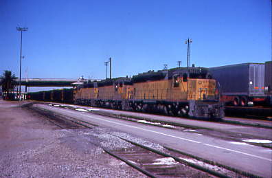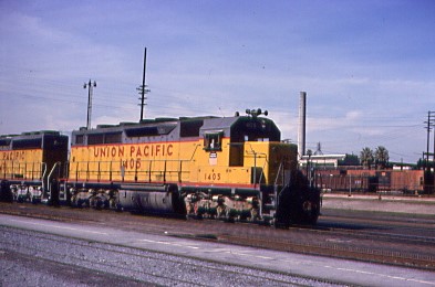 April 1979 -- Union Pacific SDP35 1405, built by Electro-Motive Division in 1965, retired in 1985 and scrapped, paid a rare visit to San Bernardino.