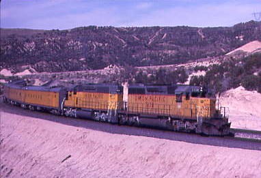 1979 -- Eastbound Union Pacific DD40AX 6940, built by Electro-Motive Division in 1971, retired in 1985 and scrapped in 1986, was climbing through Alray.