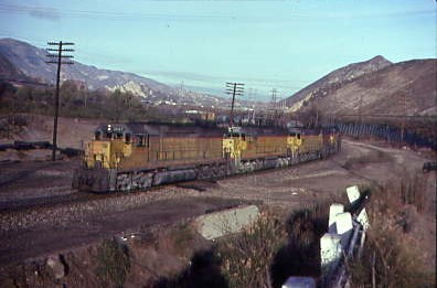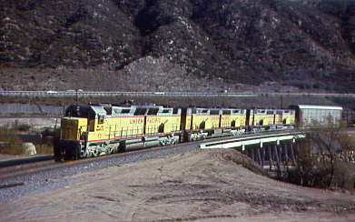 1977 -- Union Pacific DDA35 73, built by Electro-Motive Division in 1965, retired in 1981 and scrapped in 1982, Union Pacific DD35 74B, built by Electro-Motive Division in 1964, retired in 1979 and scrapped in 1980, Union Pacific DD35 94B, built by Electro-Motive Division in 1964, retired and scrapped in 1980, crossing Cajon Creek on its way towards Sullivan's Curve.