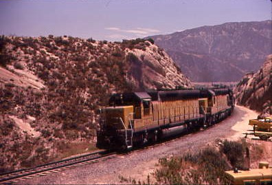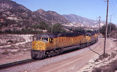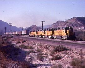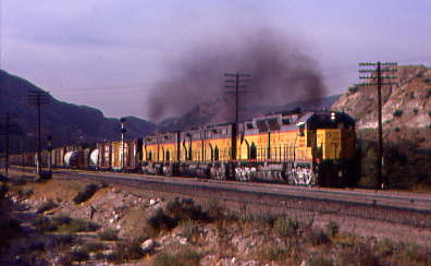 March 1974 -- Just after sunrise, Union Pacific U50C 5021, built by General Electric in 1971, retired in February 1978 and scrapped in June 1978, descended Blu Cut in Cajon Pass.