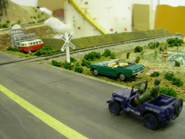 Ground cover/scenery complete, water to be poured. The street has been painted but needs some more weathering. A VW bus & the sunbathers have been procured. Figures will need to be added, and gators scratch made. Also included will be a 1965 Ford Mustang, USAF MP jeep, and Top Secret crate. The LOX tank is simply a Walthers wide storage tank, with steps to the roof. The tank also has installed a battery operating beacon light. All materials and products are being donated.