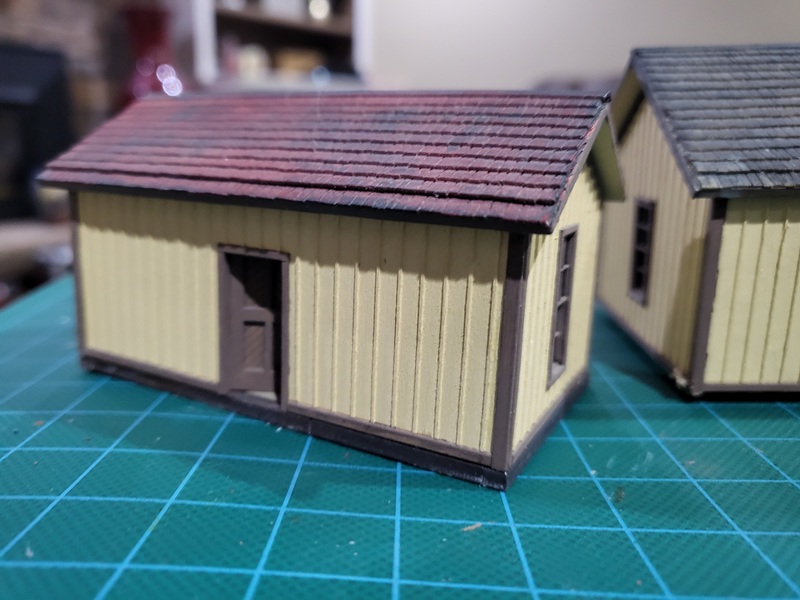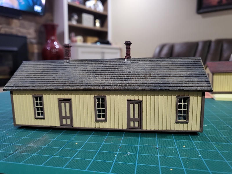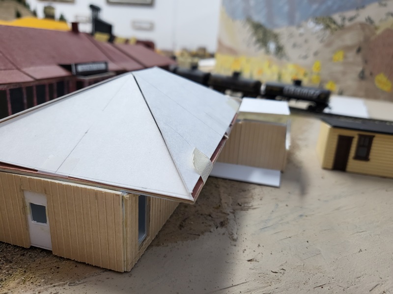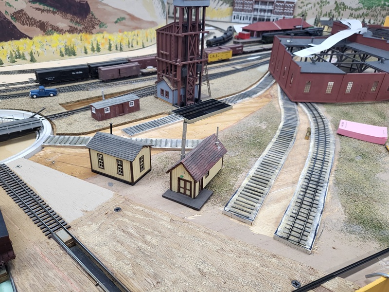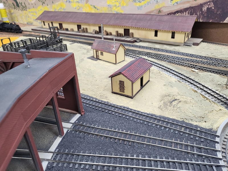 StuJ's Depot eating house and sheds complete. TomG's begun scenicking near the roundhouse and has the roundhouse tracks ballasted.