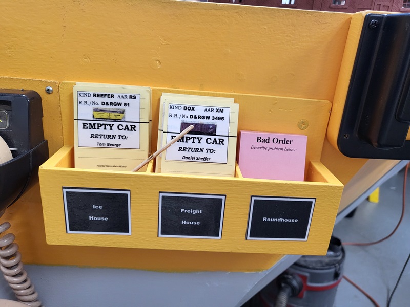 StuJ is working on the eating house and sheds behind the depot. You can see StuJ's completed freight house, and TomG's repaint of the coaling tower in the middle photo. GaryM mounted new carcard holders.