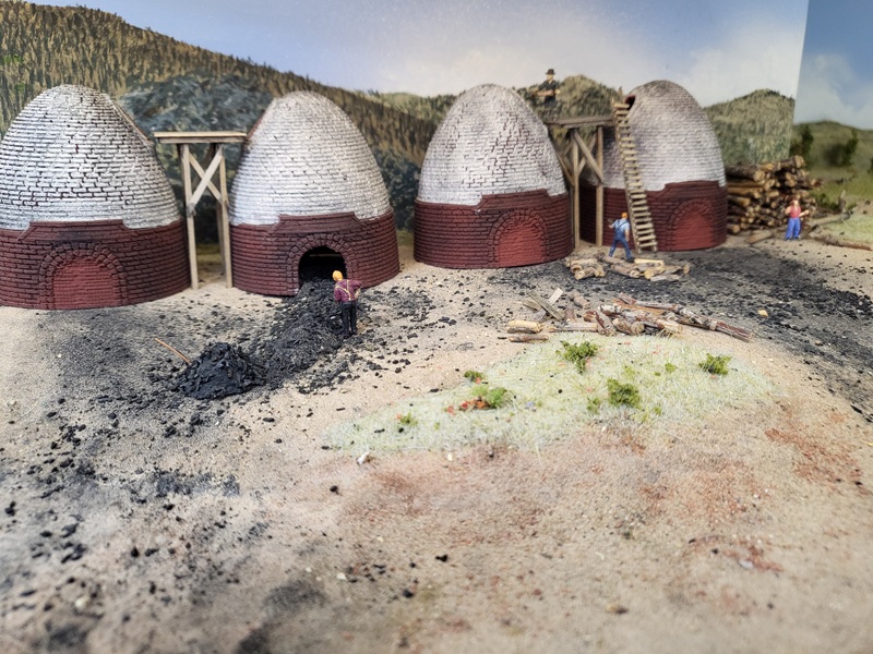 TomG worked on the dirt floor of the roundhouse, and started sculpting the grounds around the turntable and coaling tower.
