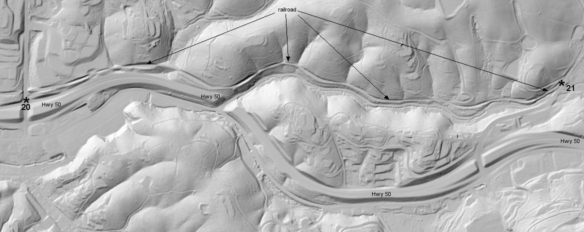 Google satellite and USGS Lidar images showing the railroad between image 20 above and image 21 below.