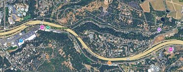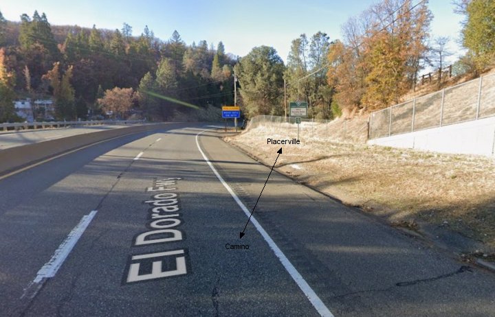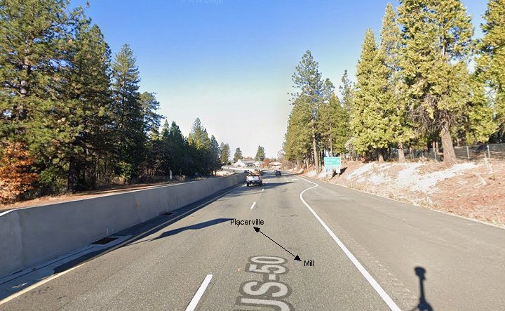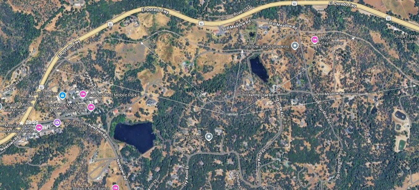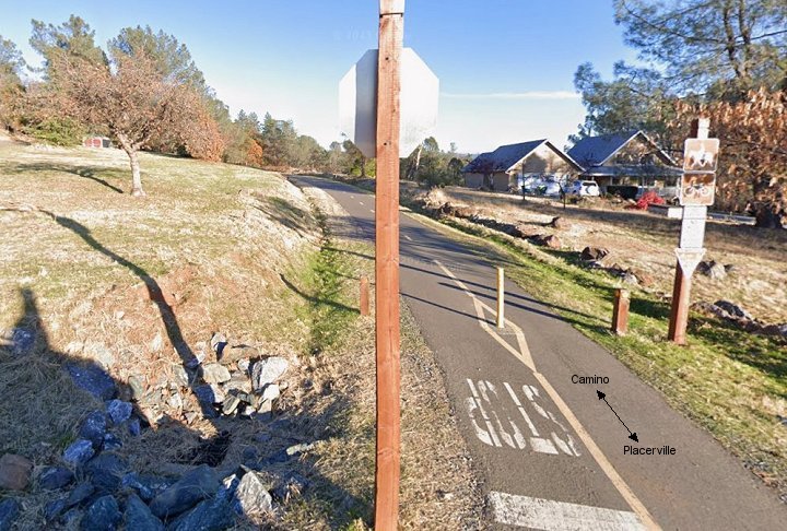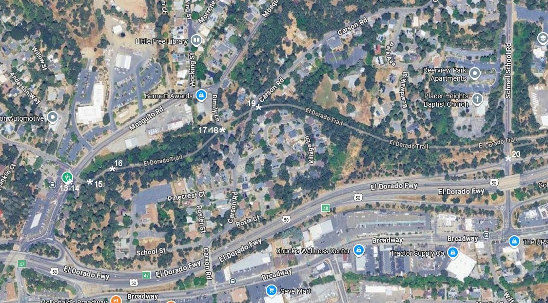 28.-29. The line once crossed Hwy 50 at grade here. The El Dorado Trail now uses an overpass in these Google street views.