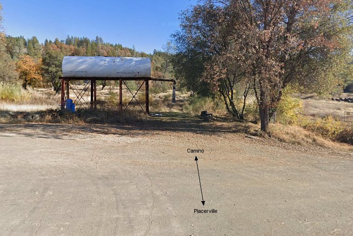 1.-2. West and east Google street views at Locust Ave. This was once a small yard. The Southern Pacific and Camino Placerville & Lake Tahoe RR interchanged trains here.