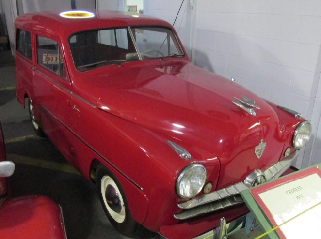 A 1951 red Crosley station wagon.