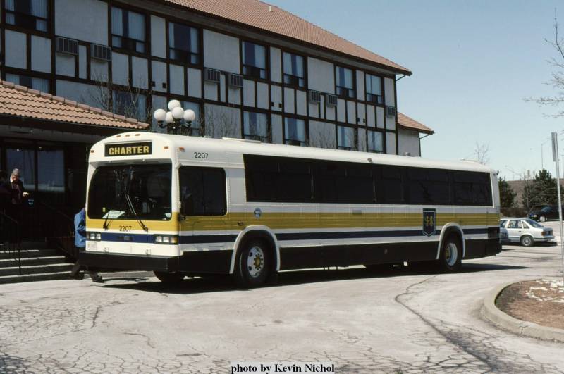 HSR #2207 at the Travelodge Hotel in Burlington, on charter service in April 1996 during the World Curling Championships. This is a Motor Coach Industries TC40-102A, originally built for the Canada Coach Lines in 1989 as CCL 2207. It was transfered to the HSR in 1993 when the City of Hamilton sold the CCL. It was leased to Greater Hamilton Tours around 2000. (Photo by Kevin Nichol, used with permission. From Esbdave's Fotki Page)