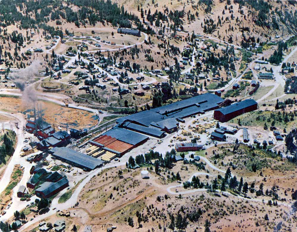 A postcard aerial view of Kinzua looking generally west across the community. The CK&S main line from Condon is visible entering the frame near the upper right corner. |