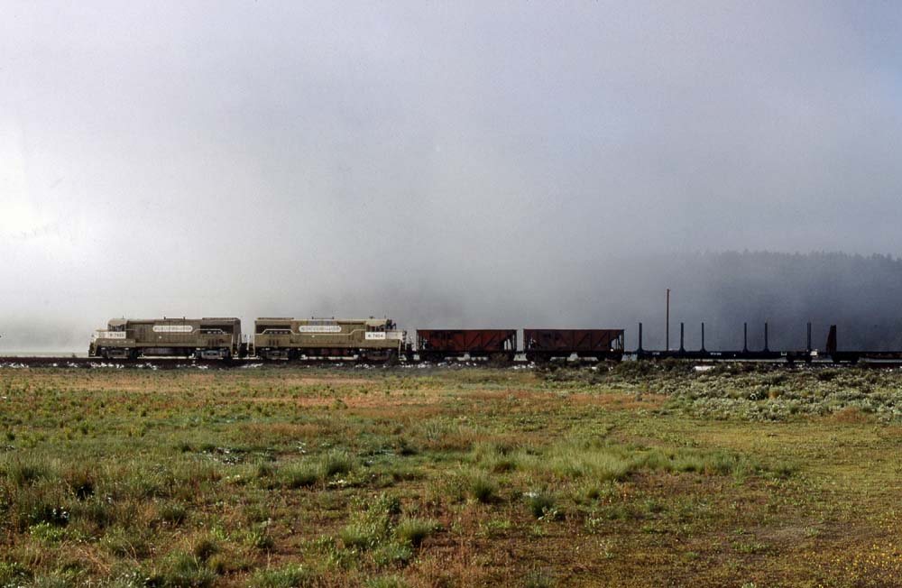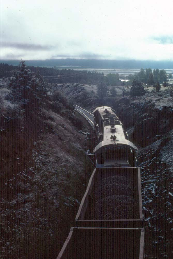 A top down view of the ballast loads in cars #094 and #095 near Dairy. Later photos John shot of the train showed the loads had been dumped along the line by the time the train reached the Bly Mountain