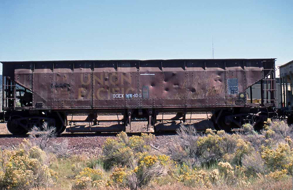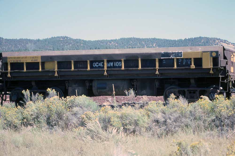 switchbacks. John Henderson photo, Jeff Moore collection. ![]() OC&E bottom dump ballast car #105 at Sycan on 28 August 1984. Jerry Lamper photo. ![]() OC&E side dump hopper #109 in Sycan on 28 August 1984. The lettering seems to show the car formerly belonged to the Oliver Iron Mining Company. Jerry Lamper photo. |