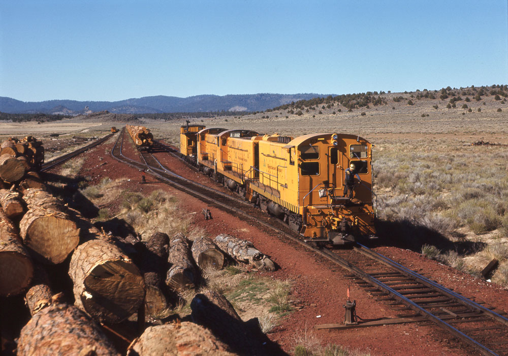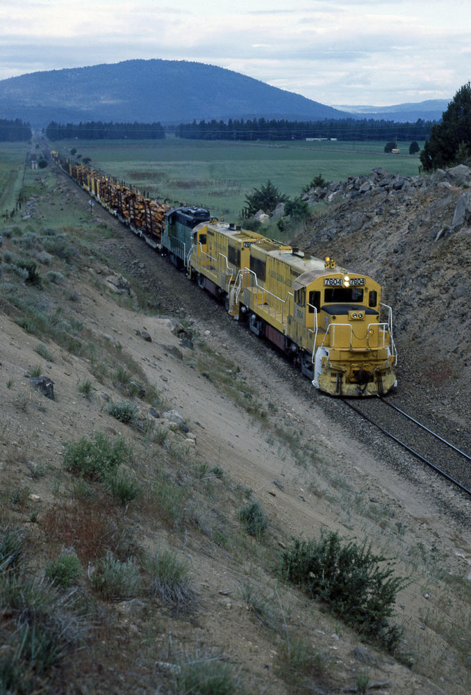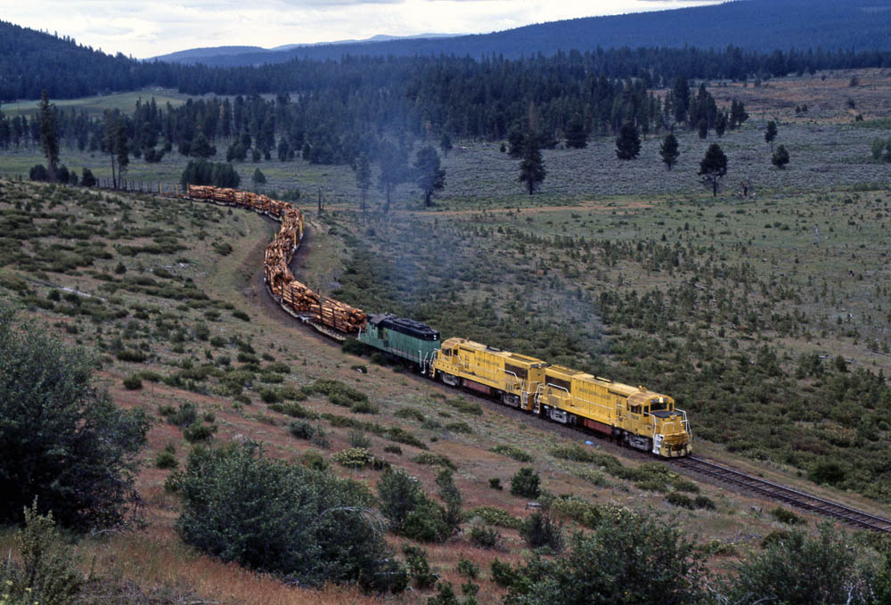 The second visit Charles made to the operation happened sometime between 1983, when Weyerheaeser replaced the Baldwins, and 1986, when Weyerhaeuser closed the Bly mill. This visit started with the #7604, #7603, and Weyerheauser #312 leading an eastbound freight crossing Highway 140 between Olene and Swan Lake. On the head end are a number of log loads being hauled to the Bly mill.