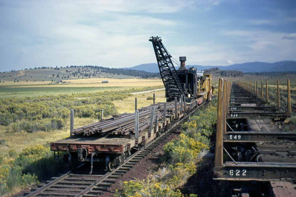 Another shot of the Orton crane and its tender, Weyerhaeuser flat #026, at Sycan. John Henderson