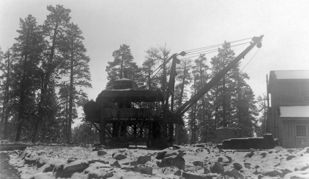 mounted on an elevated platform set on top of a heavy frame. When in use the frame would rest on the ties outside the rails, leaving a tunnel underneath the machine through which empty log cars could pass. A V-shaped