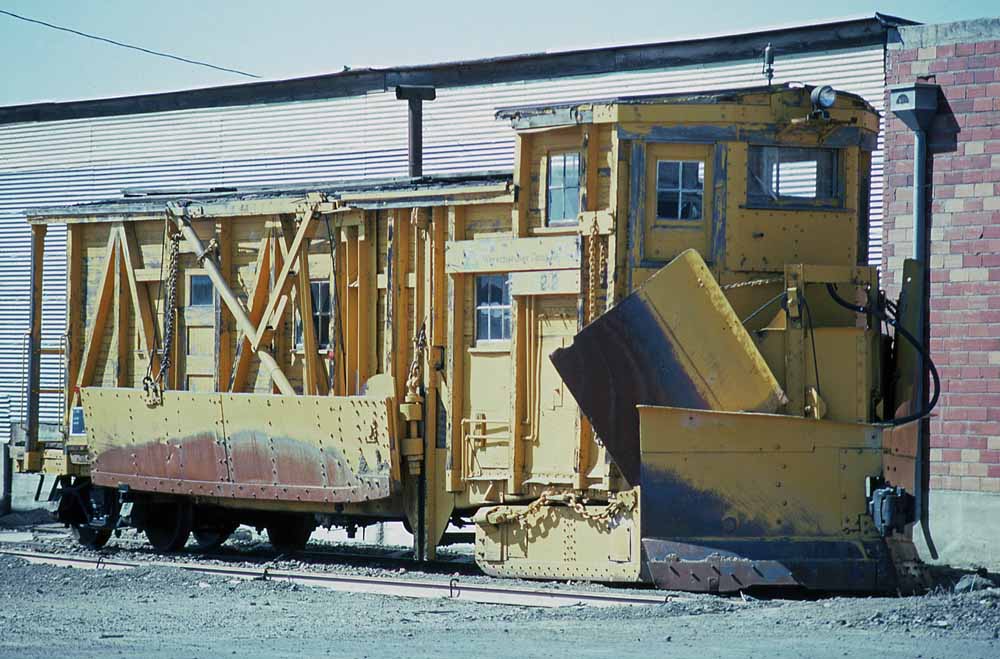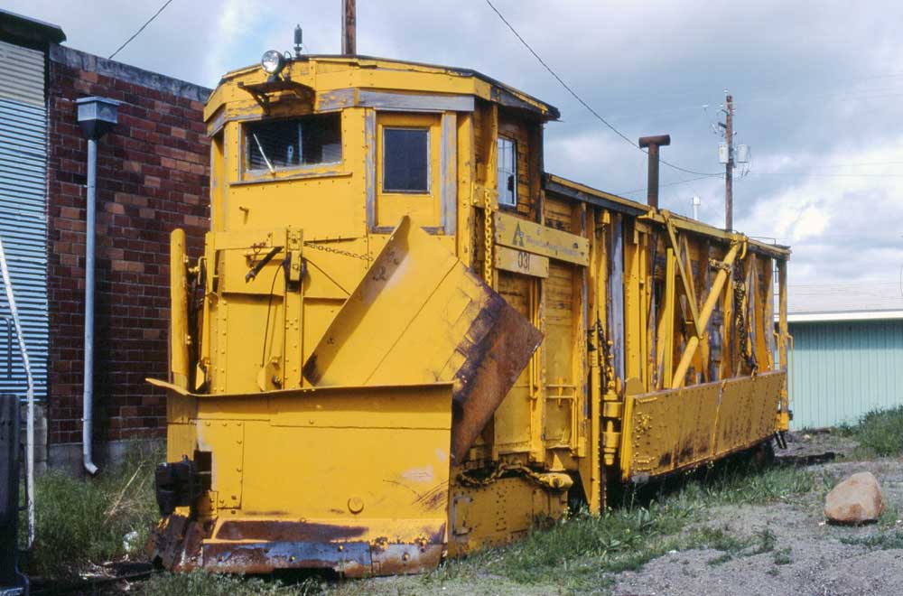 #722/#031 ![]() Plows #722 and #723 at Sycan on 23 August 1973. Note the absence of the first window behind the cab on the left side of the #722. The other major spotting difference between then is the smoke jack, on the #722 it's located on the left side of the carbody, on the #723 it's located on the right side. Jerry Lamper photo. ![]() A nice broadside view of the #722 at Sycan. Jerry Lamper collection. ![]() The plow after it had been renumbered 031 in Klamath Falls. John Henderson photo, Jeff Moore collection. ![]() The #031 survives today in the Train Mountain collection near Chiloquin. James Hughes photo. |