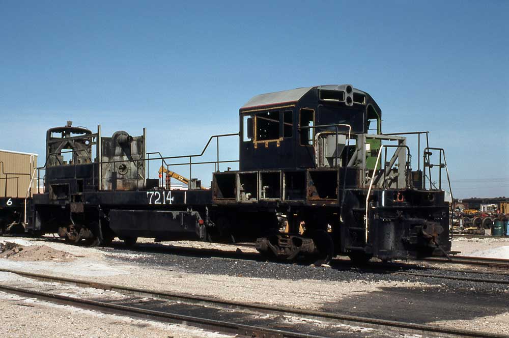 The former Union Pacific U25B that would become OC&E #202 and then #7602 stripped down and ready to begin the rebuild process at Morrison-Knudsen's shops in Boise on 14 April 1976. Jeff Moore collection. |