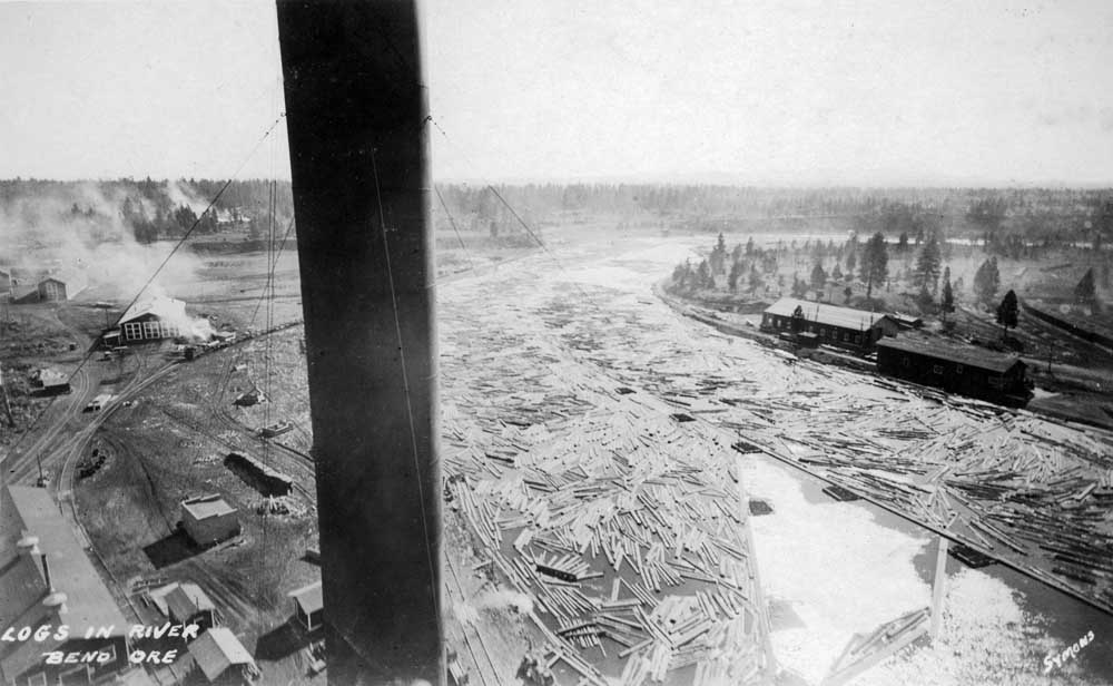 the sprawling Brooks-Scanlon mill across the river to the right. Downtown Bend lies behind the mills.