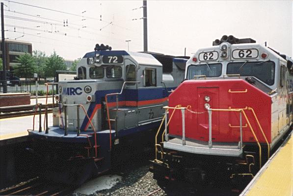 MARC No.72 & No.62 - MARC's two standard diesels - the GP39H-2 and the newer GP40WH-2, at Camden Yards. The catenary behind no.72 belongs to the MTA's Light Rail system, adjacent to the MARC platform. June, 1996.