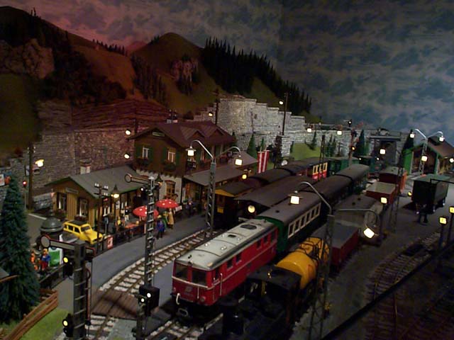 This is another picture of the freight yard at night. It was set up so when a train comes in, another one leaves.