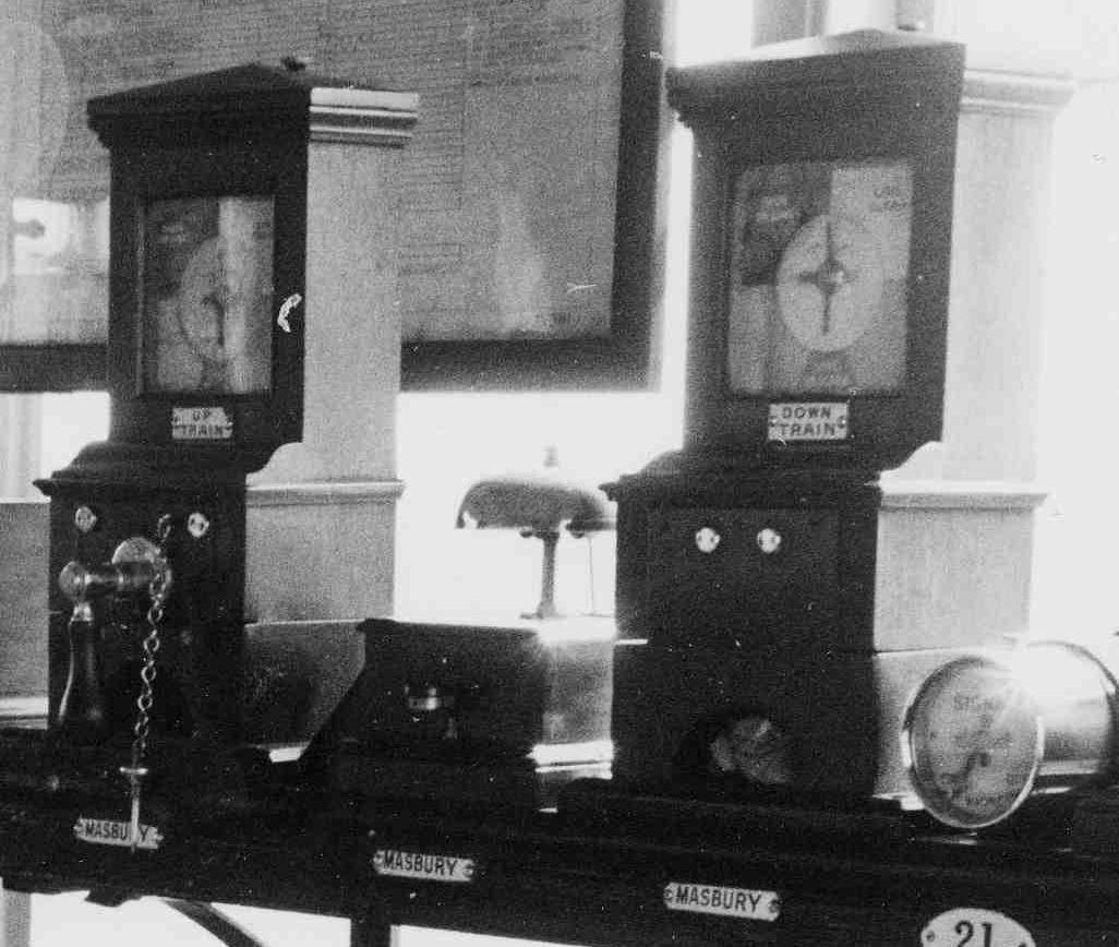 The Southern Railway block instruments were of a type where the commutator was prevented from turning to 'Line Clear' by an electro-magnetic lock released by a push-button on the instrument. At Masbury the push-button was wired to the commutator lock via lever 5 at Binegar (the bank staff release lever), to ensure that Masbury could not peg 'Line Clear' for a Down train if the bank staff was out of its lock at Binegar. When Masbury was closed the operation of its closing-switch extended this circuit through to Winsor Hill (and similarly through to Shepton Mallet when Winsor Hill was closed), so that in each case the release lock at the next box down the line from Binegar that was 'in switch' was controlled via lever 5 at Binegar. Fortunately Shepton Mallet was not fitted with a closing switch, or else this circuit might have stretched a long way done the line! It is strange that the SR left a mixture of equipment in use and did not replace all the instruments at once, but no doubt cost was a factor.