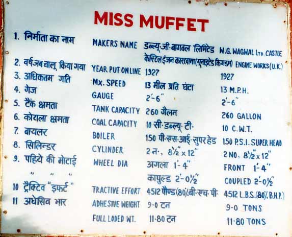 Hercules_3.jpg (39729 bytes)  Specs for Miss Muffet. (My comments: Class CS #776 on Eastern Bengal State Railway was built in 1932 by Yorkshire Engine Co., Sheffield. U.K. Her sister loco #773 was built in 1927 by W.G. Bagnall, Stafford, U.K.  Source: Indian Locomotives Part 3 by Hugh Hughes.)
