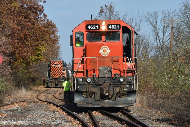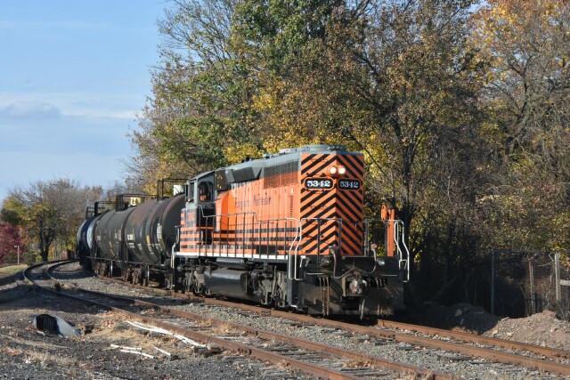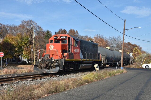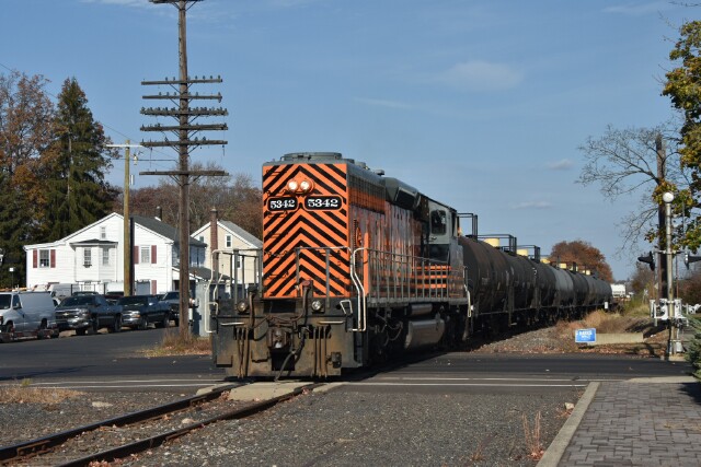November 6 2024 East Penn Railroad Bethlehem Branch local ESPN QT-6 with GP9R CLNA 4621 grabbing three tank cars at Washington Street in Telford PA. |