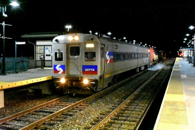 | Fall is leaf season on SEPTA and time for them to start running their wash trains. November 16 2024 finds Wash 1 through North Wales Station on the Lansdale/Doylestown Line. |