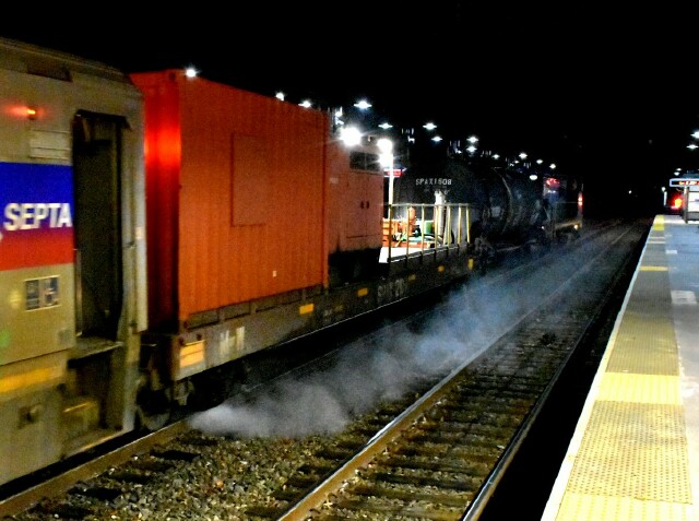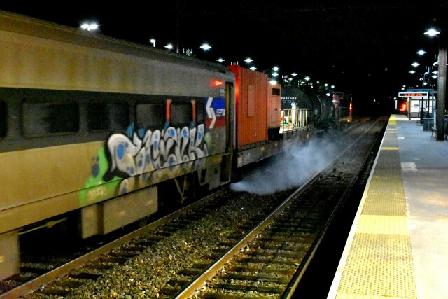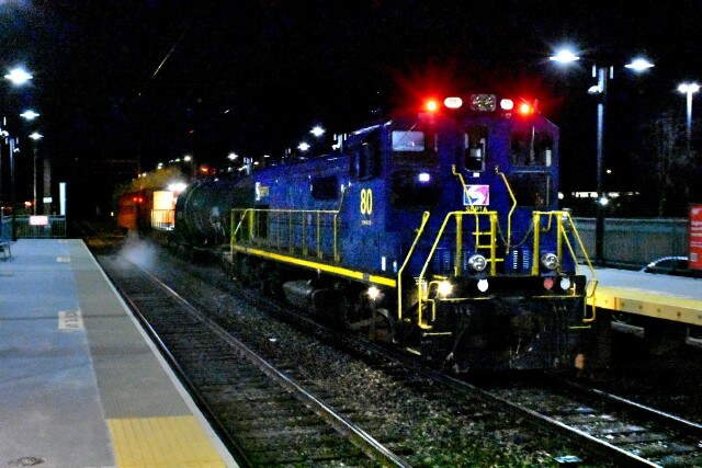 | Up at Colmar Station, the train paused while the crew got their lunch at CP Wawa. On the long hood of 80 you can see the splatter from the gel. |