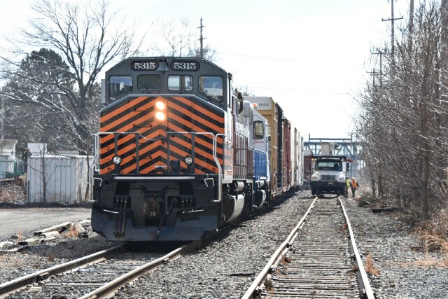 | February 10 2010 Pennsylvania Northeastern Railroad Bethlehem Branch local L160 with SD40-2W PN 5313 and GP39-2 NHRR 901 working the yard as usual, but this time with competition for the railroad as a tree clearing crew has been brought in to do some trimming. |