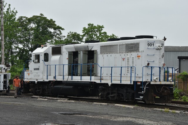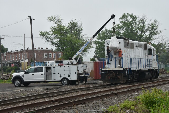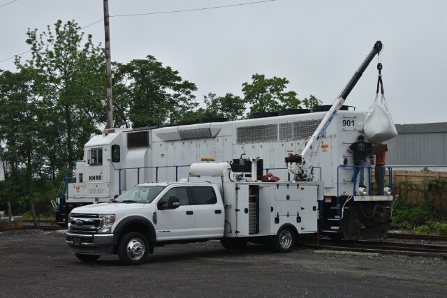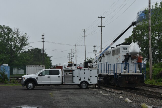 | May 16 2025 Fridays are usually busy days in Lansdale with the arrival of new cars on CSX L042, but L042 ran yesterday so this Friday became maintenance day, starting with adding sand to GP39-2 NHRR 901. |