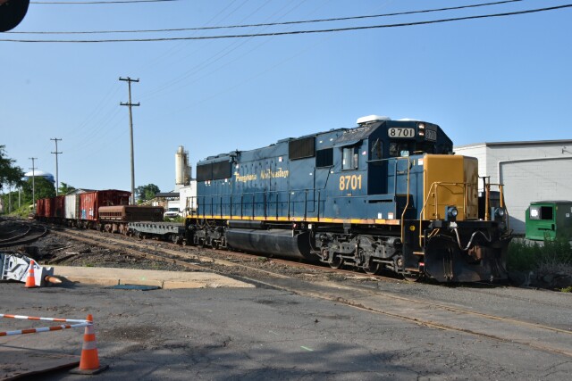 | June 2 2025 CSX L042 had been arriving in Lansdale in the mid-morning lately, so it was not a surprise to eventually see PN L160 work the branch at the same time. PN L160 was spotting some tank cars in storage as well as a cut of MOW cars on the industrial track while L042 comes up the runner. |