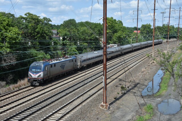 | July 12 2025 My daughter's car had trouble on the way to a bridal shower, so the call goes out to dad. The car was parked at Linden Avenue in Philadelphia, so I drive down to the city to give her my car so she could go to the shower while I wait for a tow, which would take over an hour to arrive. Fortunately the car was just a block from the NEC and I had my camera, so the time went by pretty quickly, starting with an eastbound Keystone with cab car AMTK 9636 leading on Track 2. |