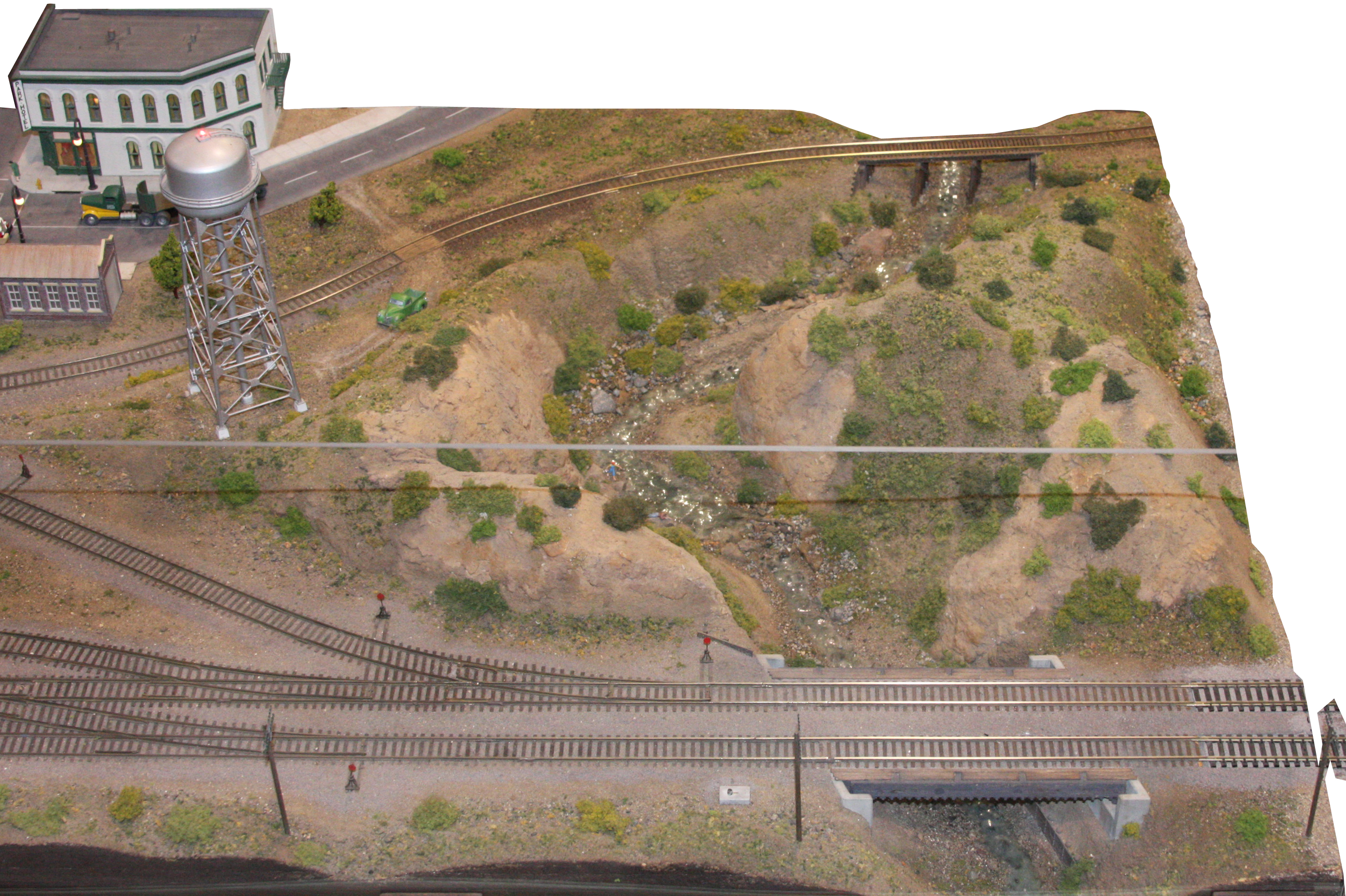 A variety of sidings serve lineside businesses. At the east end, a stream flows through a canyon beneath the plate girder bridge of the mainline. Fred scenicked an adjacent club corner module with similar rocky canyons that depicts the rugged country near the Tehachapi Loop.