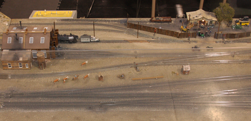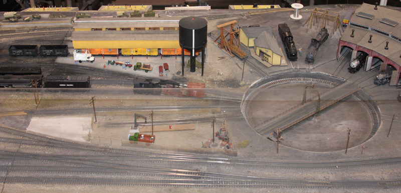Peter's main group of modules depict a Union Pacific service terminal and passenger station along with adjacent businesses. The six-stall roundhouse is served by an operating scratchbuilt turntable and is flanked by locomotive service structures such as a coaling tower and water facilities. Motorized chain-link gates protect goods within the loading track area.