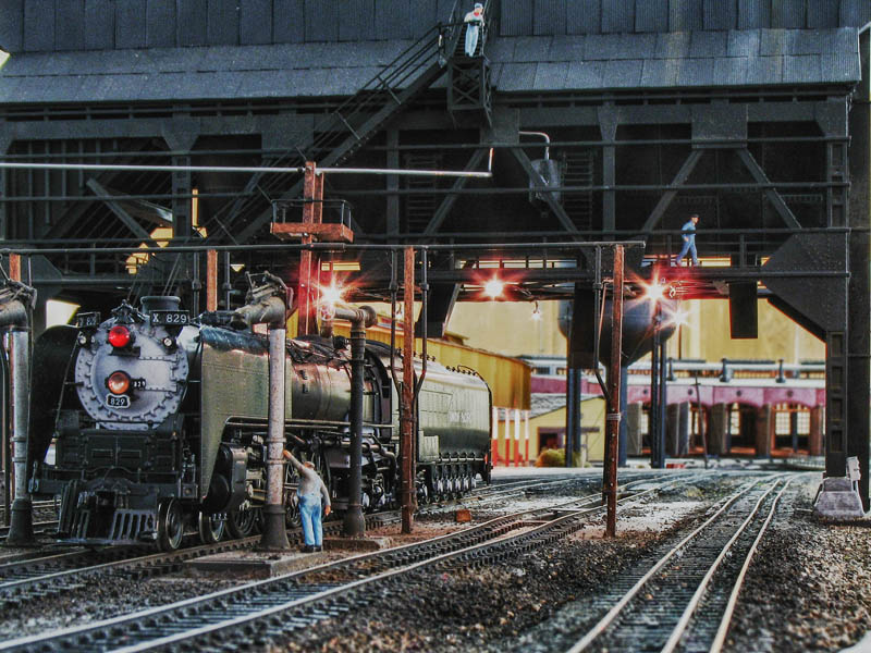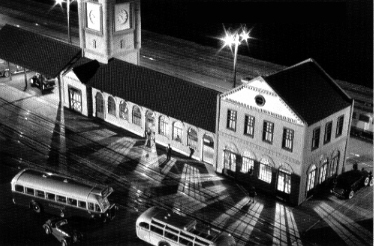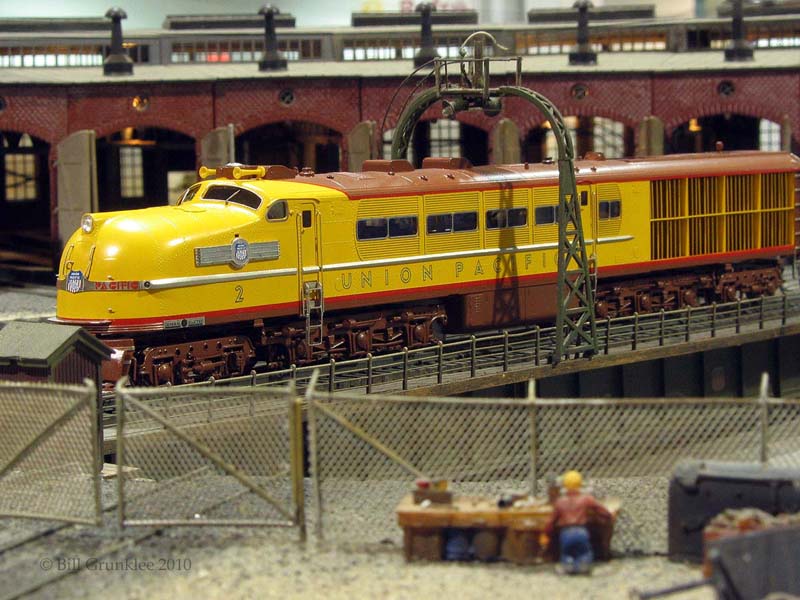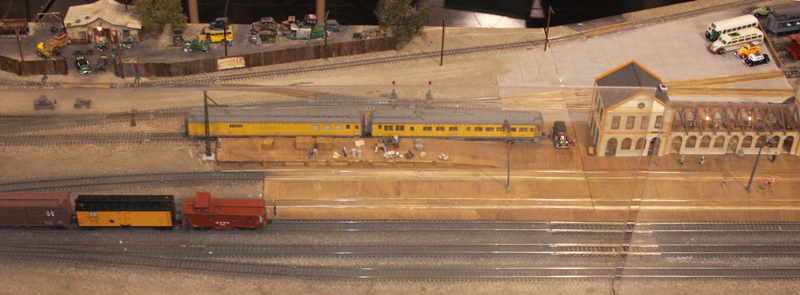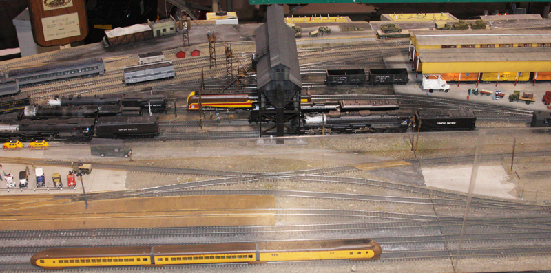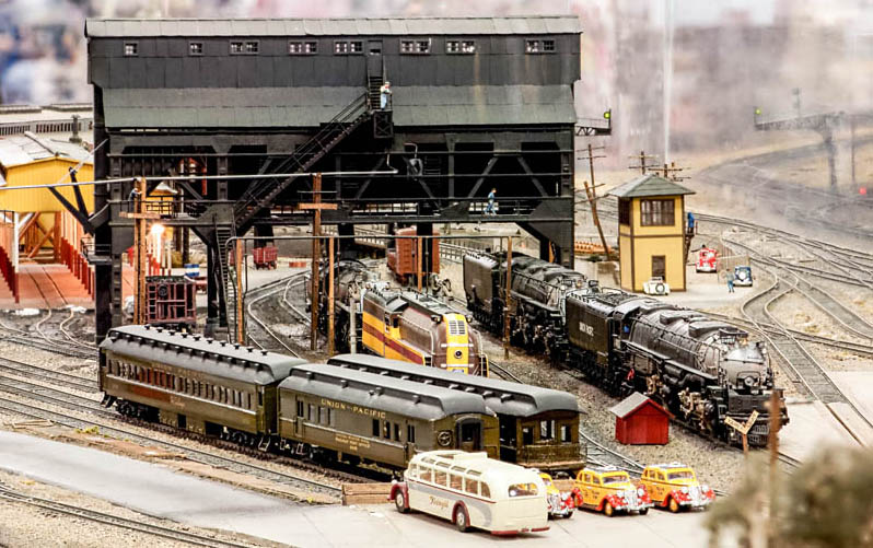 A scratchbuilt passenger terminal depicts the UP's Cheyenne, Wyoming station. Interior station details include rotating ceiling fans and four clocks in the tower made from watches that show the correct time. A scratchbuilt three-stall engine house serves standard gauge and HOn3 locomotives. Peter's modules earned the Module Best of Show award at the 1996 National Model Railroad Association National Train Show in Long Beach, California