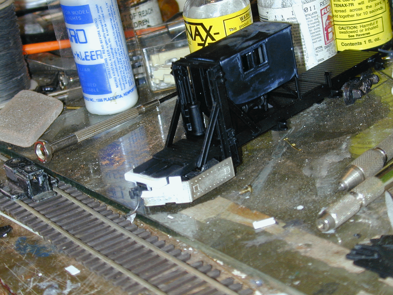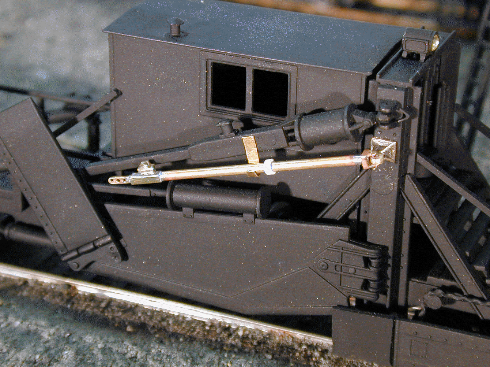 This model 2-180 started as a Walthers 2-200 and the front end was modified using the Bob Rzasa/Custom Finishes conversion kit. All the side blades were modified to make them movable. I drilled out the hinge points with a number 76 drill and added .020 wire pins. Plastic was used to straighten the front platform and to make the coupler box look better. The front plow was made more correct by adding a fixed blade above the movable one. Wire grab irons were added to the frame front and the front plow cylinder supports.