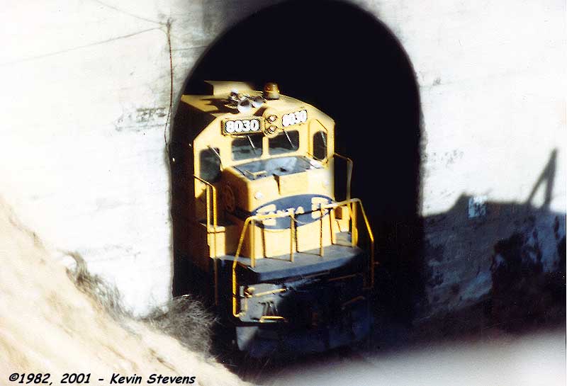 A Santa Fe C30-7 pokes its head out of the west portal of the Loop Tunnel.