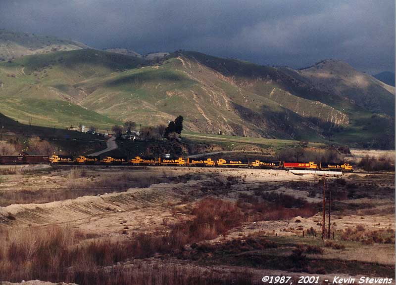 Heading uphill toward Tehachapi, a Santa Fe train passes the east end of Caliente siding, soon to turn back 180 degrees after traversing the horseshoe curve.